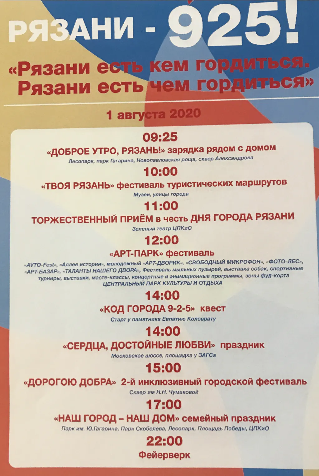Никаких массовых мероприятий на День города в этом году не будет. Однако администрация города анонсировала несколько мероприятий, с помощью которых рязанцы все-таки смогут прочувствовать дух праздника. В этом году Рязани исполняется 925 лет. Эта цифра станет лейтмотивом праздника.