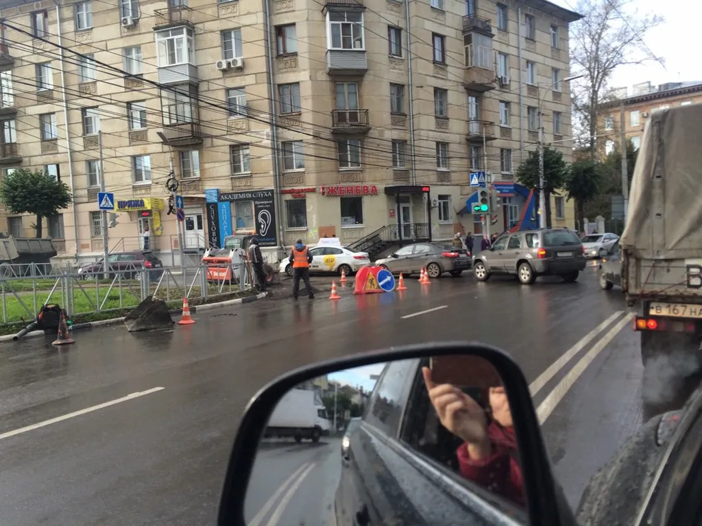 Из-за ремонтных работ на перекрестке водители не могут совершить поворот налево, что вызвало большую пробку.