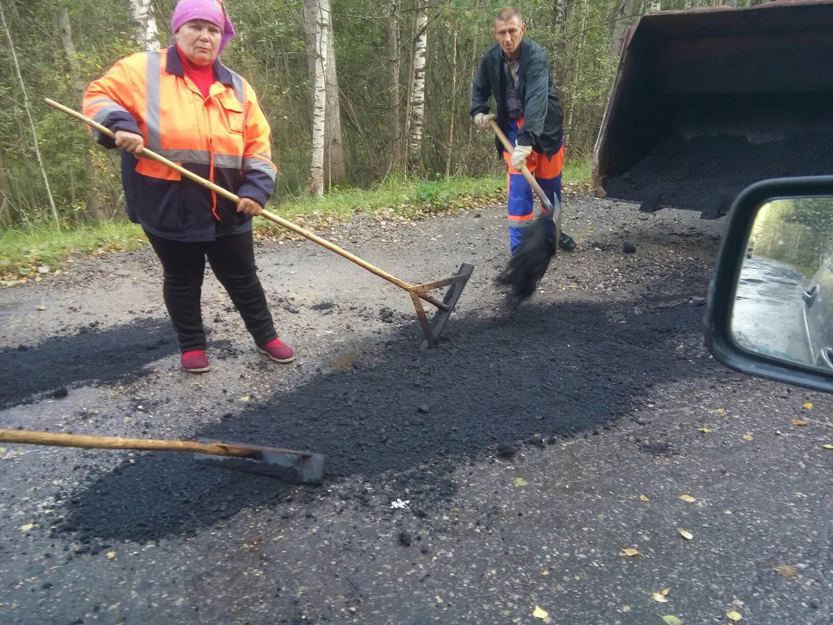 Сами работы проводятся в дождь, что, к слову, уже никого не удивляет. На фото не видно катка, заметен лишь ковш бульдозера, из которого рабочие лопатами достают свежее дорожное покрытие и засыпают им ямы.