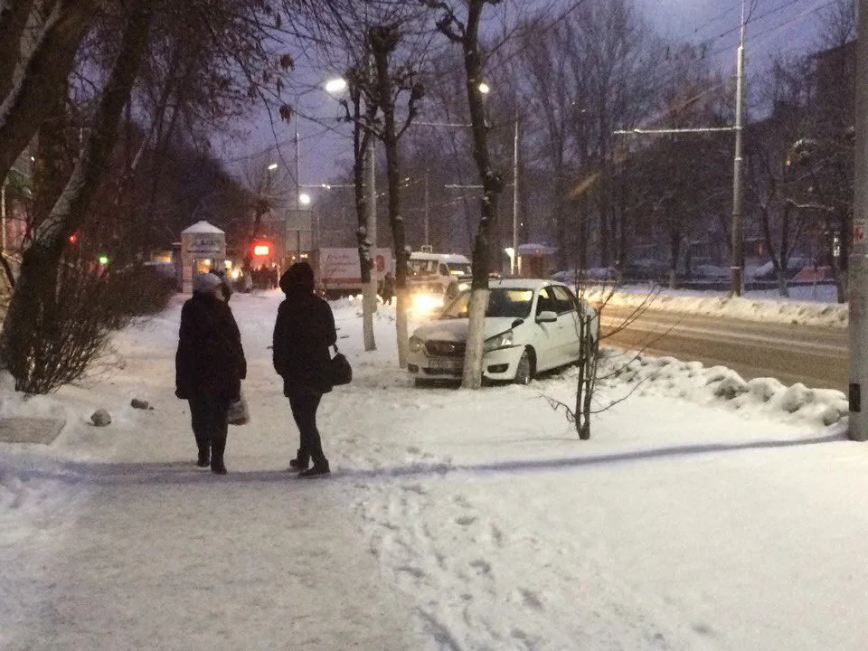По словам пешеходов, водитель не справился с управление и автомобиль занесло в дерево. Постарадавших на месте аварии нет.