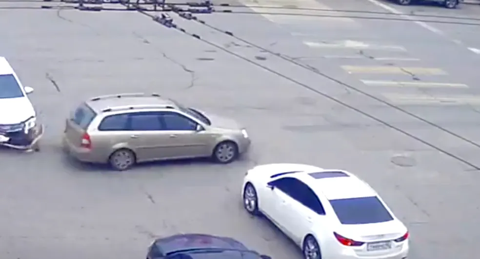 На видео машина с разбитой фарой пытается проехать перекресток. Судя по тому, что поток остался на месте, можно предположить, что светофор не успел загореться зеленым светом. В этот момент на перекресток выезжает другой автомобиль и по касательной задевает первого. Как итог, вдобавок к разбитой фаре и помятому крылу прибавился бампер и, возможно, капот.
