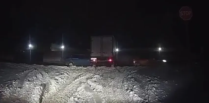 ДТП произошло в сумерках - грузовик поворачивал направо, когда в него врезался легковой автомобиль. Судя по ролику, автомобили сильно не пострадали, ДТП произошло по невнимательности.