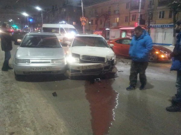 В среду вечером читатель портала progorod62.ru прислал в редакцию фото, на котором зафиксирована авария на улице Дзержинского. Предположительно ДТП произошло около 21:20. Присланные снимки не лучшего качества, но на них можно разглядеть три автомобиля - участника инцидента - ВАЗ двенадцатой модель, Audi предположительно A4, и дорогую, спортивную иномарку ярко оранжевого цвета.