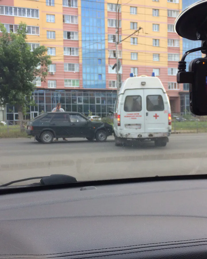 Девушка сделала фотографию с места происшествия. На фото отечественный автомобиль столкнулся с машиной скорой помощи.