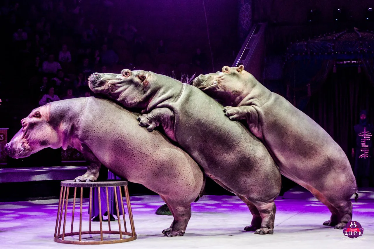 Главным сюрпризом шоу станет единственный в мире аттракцион с группой гиппопотамов под руководством народного артиста России Тофика и Людмилы Ахундовых. Перед зрителями предстанут сразу три огромных полуторатонных африканских бегемота. Бытует мнение, что эти животные медлительные, неповоротливые и вовсе не поддаются дрессуре. Однако четвероногие артисты докажут обратное. Находясь от зрителя на расстоянии вытянутой руки, эти тяжеловесы исполнят невероятные трюки, достойные книги рекордов Гиннесса.