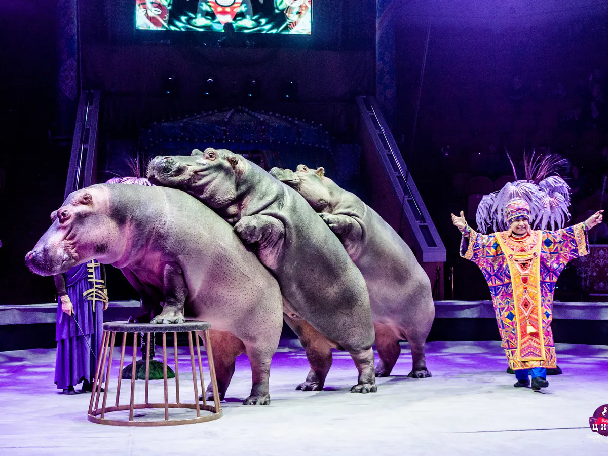Помимо бегемотов в шоу задействованы и другие животные - обезьяны, верблюды, собаки, павлины и лошади. Зрители увидят достаточно редкий сейчас жанр – жокеи на лошадях. Также публику ждет множество воздушных номеров, в том числе и без страховки, буффонадные жонглеры на моноциклах, эстрадный балет, эквилибристы на рейнских колесах.