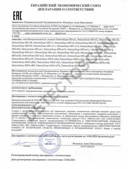 На сайте представлено только 6 (шесть) моделей металлоискателей в ценовом диапазоне от 6 (шести) до 17 (семнадцати) тысяч рублей, а также одна модель пинпоинтера с названием DetectoScan PinPointer, нитратомер DetectoScan Nitrate и дополнительные датчики. Но судя по размещенной на сайте Декларации о соответствии, выданной Евразийским экономическим союзом, который содержит в себе около 40 (сорока) наименований моделей металлоискателей под брендом DetectoScan MD на сайте представлен далеко не весь ассортимент приборов. Как уверяет производитель весь размещенный товар – результат собственных трудов завода - изготовителя (от разработки чертежей и написания программного обеспечения, до сборки и упаковки).