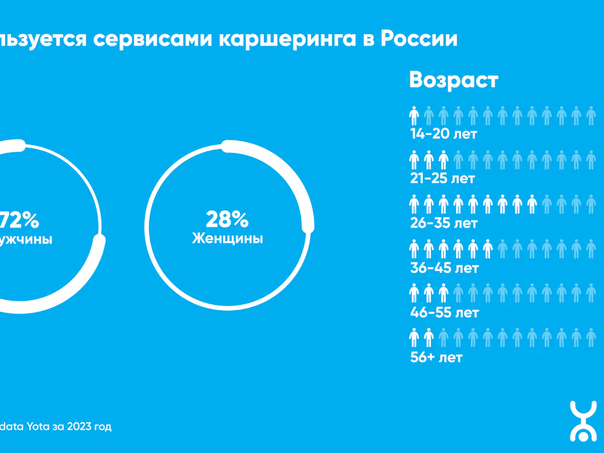 Большинство пользователей каршеринговых сервисов — мужчины (72% аудитории). Однако именно женская аудитория обеспечила основной прирост интернет-трафика таких приложений в 2023 году (+16%).