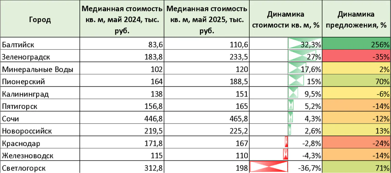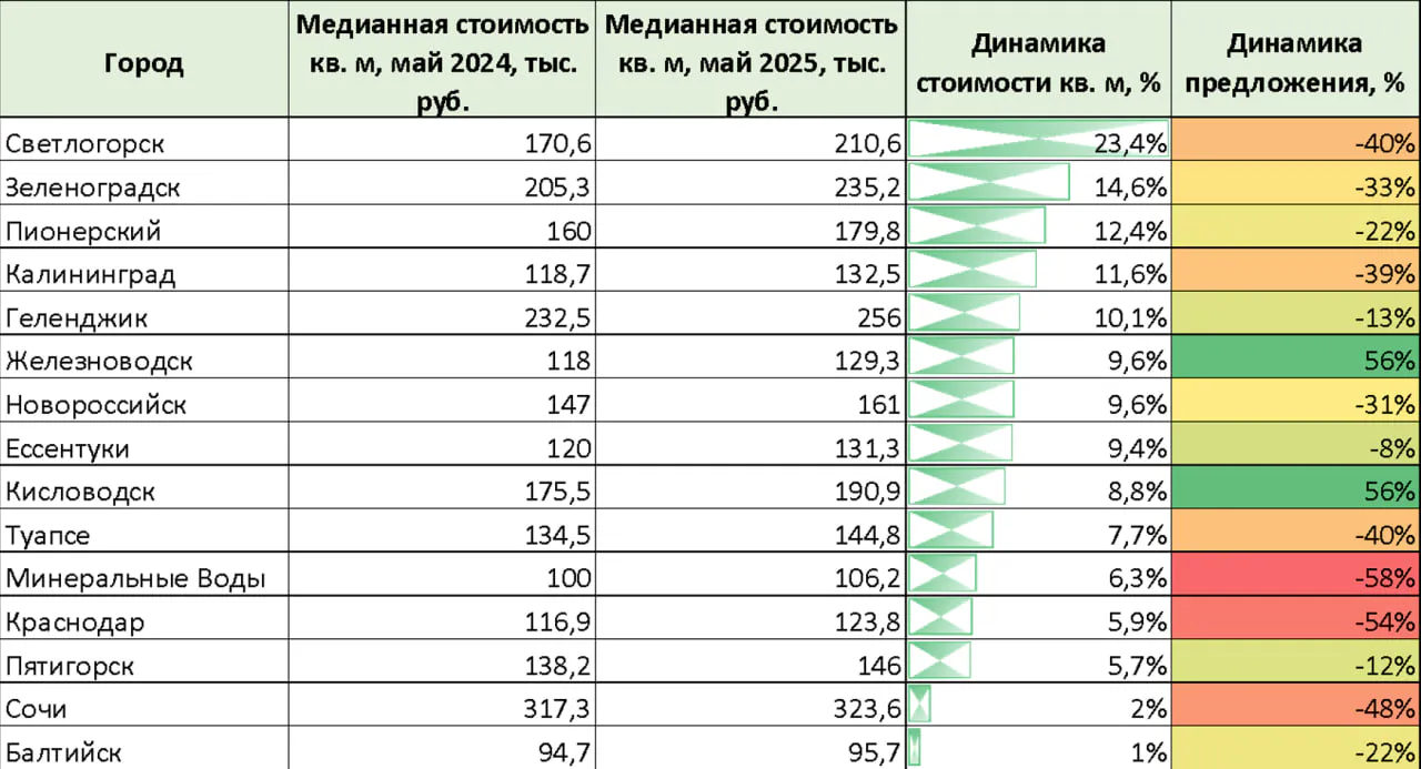 Снижение цен зафиксировано в Краснодаре (-2,8%), Железноводске (-4,3%) и особенно резко в Светлогорске (-36,7%, с 312,8 до 197,9 тыс. руб./ кв. м).