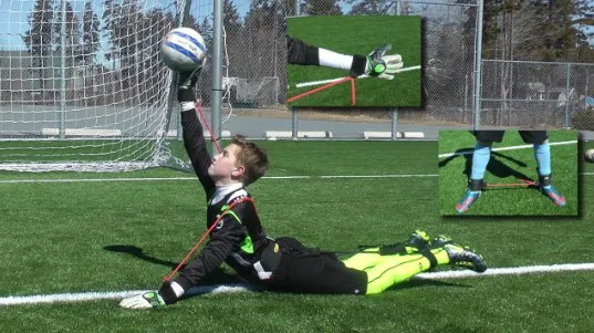 - Боковые шаги с лентами. Вратарь должен скользить вдоль линии ворот, как кошка. Ленты дают нагрузку на бёдра — и вот уже ноги готовы к любым манёврам.