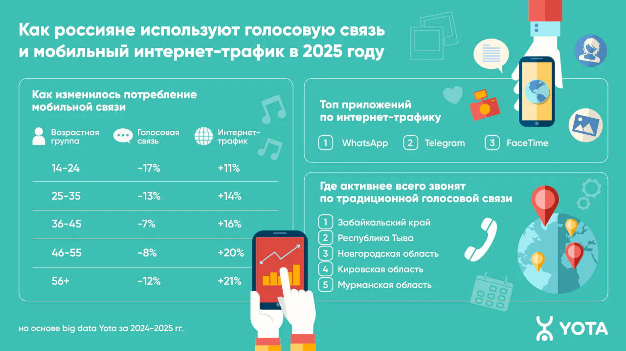 Снижение интереса к классическим звонкам особенно заметно у молодой аудитории. С января по май 2025 года у пользователей 14-24 лет средний объем голосового трафика упал на 19%, тогда как мобильный интернет-трафик вырос на 20%. Похожая динамика наблюдается и у миллениалов в возрасте 25-35 лет: традиционные звонки у них сократились на 30%, а мобильная передача данных выросла на 4%.