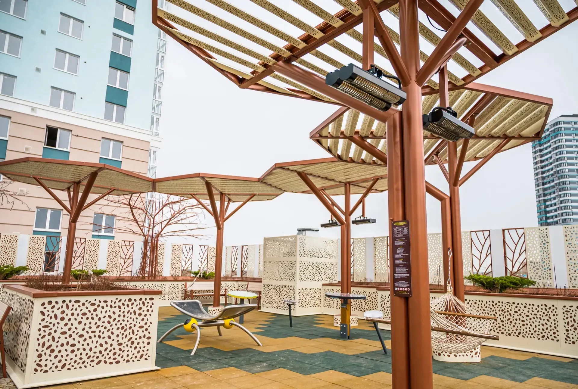 Прохладные дни больше не нарушат ваши планы! На стилобате ЖК «Еврокласс-4» установлены навесы с инфракрасными обогревателями, которые подарят большим и маленьким жильцам дополнительное тепло.