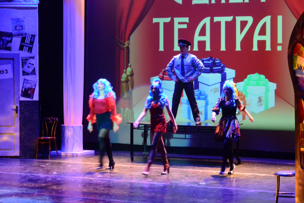 А театр на Соборной, перед своим выступлением, настоятельно рекомендовал зрителям “Отключить мозги”. Актеры исполнили театрально-музыкальный номер "Девушки с низкой социальной ответственностью на культурном перевоспитании."