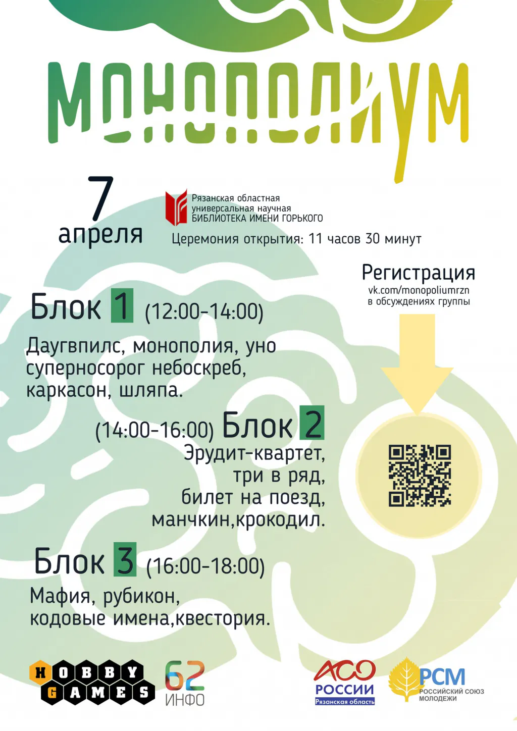 Фестиваль настольных и нестандартных интеллектуальных игр. Уже сейчас начинай заговаривать игральные кости, читать умные книжки (или хотя бы просто читать), тренировать язык тела, дикцию и эрудицию, память и внимание, чтобы в день Х проявить себя во всей красе! Участвуй один или собери свою команду - весело будет в любом случае! Ссылка на мероприятие: https://vk.com/monopoliumrzn