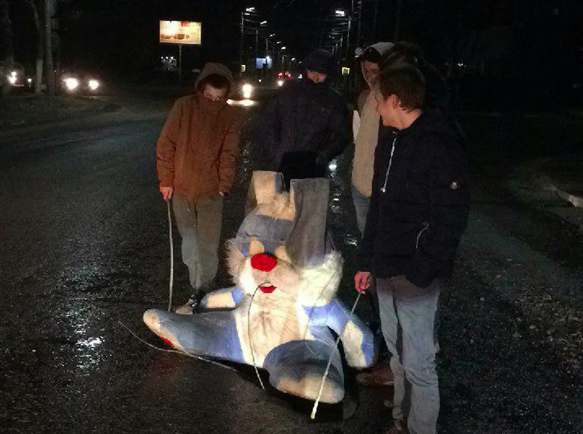 Несколько молодых людей, управляя автомобилем Рено,  пробили колесо в грубокой яме, образовавшейся в асфальте. Парни придумали интересный способ уберечь от опасности других водителей, проезжающих это место - они  посадили в глубокую выбоину огромного плюшевого зайца. А взяв в руки  палки, подобранные на обочине, они крутили ими как "гаишники", привлекая внимание других водителей. (Кстати, тут материал о том, как отремонтировать машину, поврежденную в яме, за счет городской администрации).