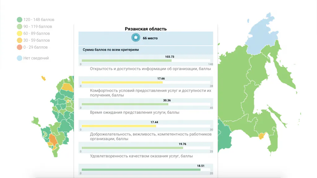 После анализа всех собранных данных, публикуется общий рейтинг регионов. Он показывает, насколько жители различных областей довольны качеством оказываемых услуг. Рязанцы, по всей видимости, не слишком довольны. Наша область занимает в рейтинге не самое почетное 66 место.
