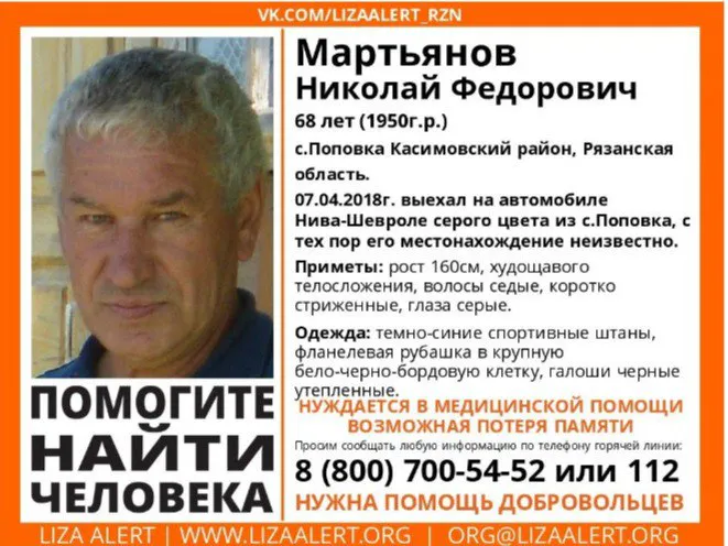 7 преля, 68-летний пенсионер Мартьянов Николай Федорович выехал из села Поповка Касимовского района на Chevrolet Niva серого цвета. С тех пор, местоположение мужчины неизвестно.