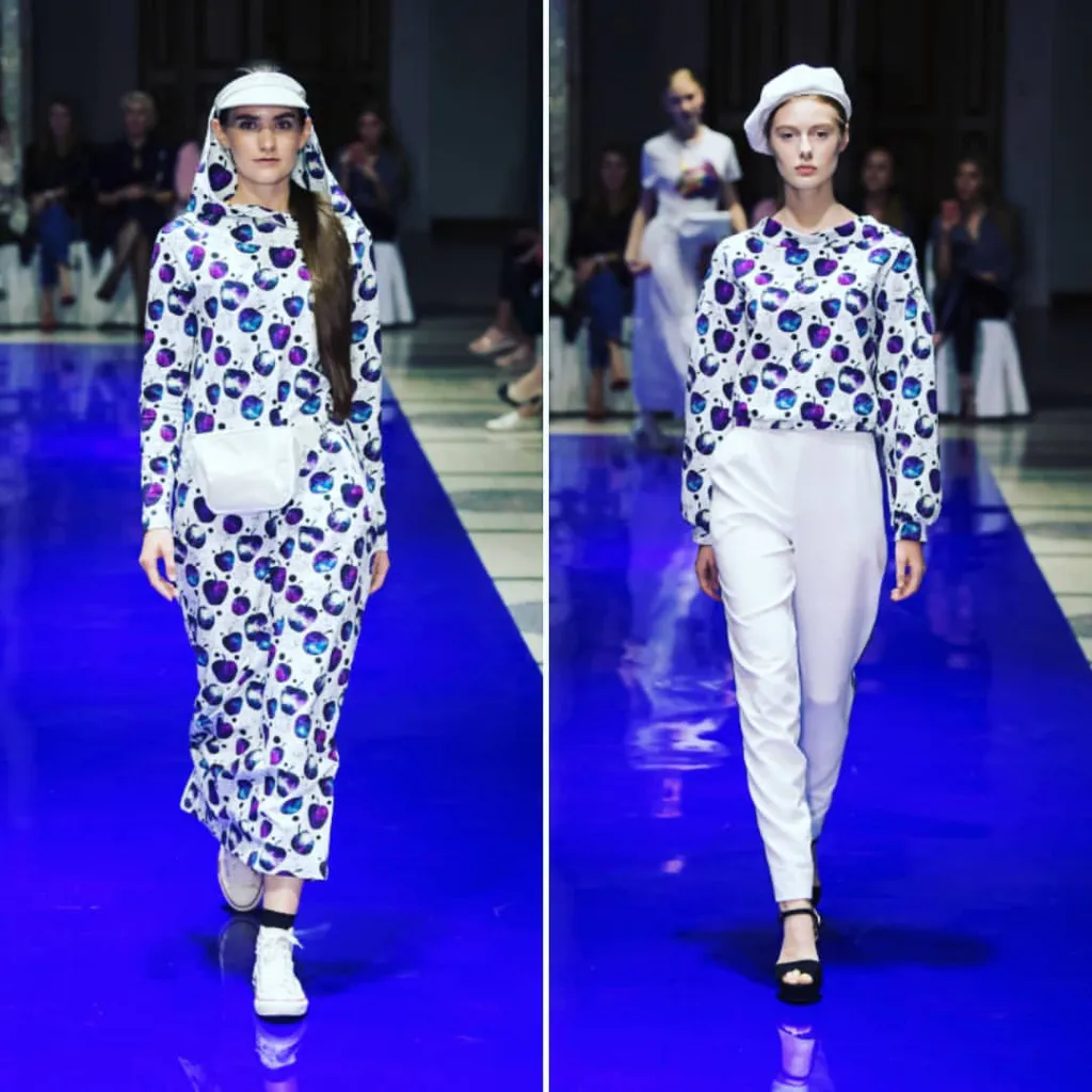 Мода - она же циклична, меняются просто силуэты. Единственное, что я добавила - это яркие юмористические принты, потому что считаю что без юмора жить невозможно. Были и мультяшки “Том и Джери” и яблоки с космическим принтом. Из тканей я использовала трикотаж, джинсу и эко-кожу.