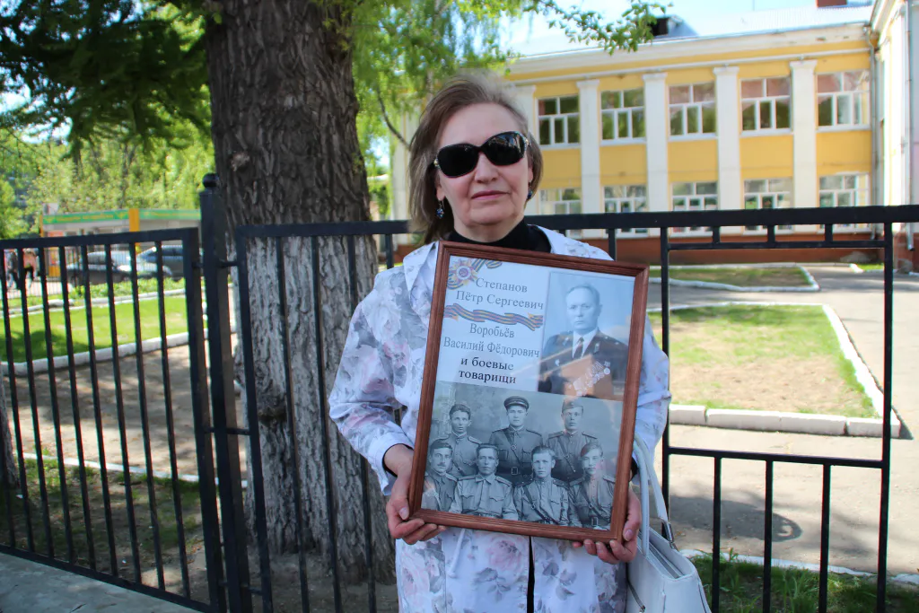 Сегодня я пришла одна. Хочу, пройти в шествии и еще раз подумать о своих родных. У меня воевал папа и дядя. Папа после военного училища в сорок четвертом году ушел на фронт. Войну закончил уже под Прагой. Слава богу, серьезных ранений не получил, была только небольшая контузия. Он получил орден "Красной звезды" за отвагу. Дядя Василий Федорочи Бородинов закончил Барнаульское училище. Он был летчиком-инструктором и просил, чтобы его взяли на фронт. Затем воевал в Сталинграде. Мне очень нравится, что была придумана эта акция. Что есть возможность пройтись по улицам города с портретами близких людей. У нас так много желающих! Это поразительно.