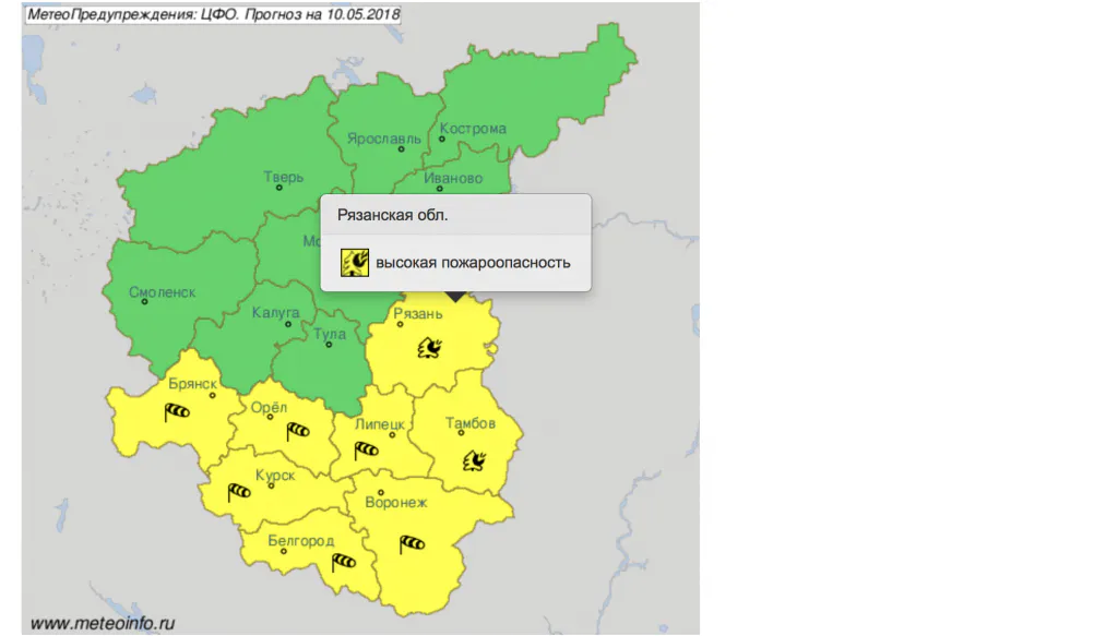 10 мая в Рязанской области Гидрометцетр России объявил «желтый» уровень пожарной опасности. Он объявлен из-за высокого уровня пожарной опасности. Об этом сообщил официальный сайт Гидрометцентра.