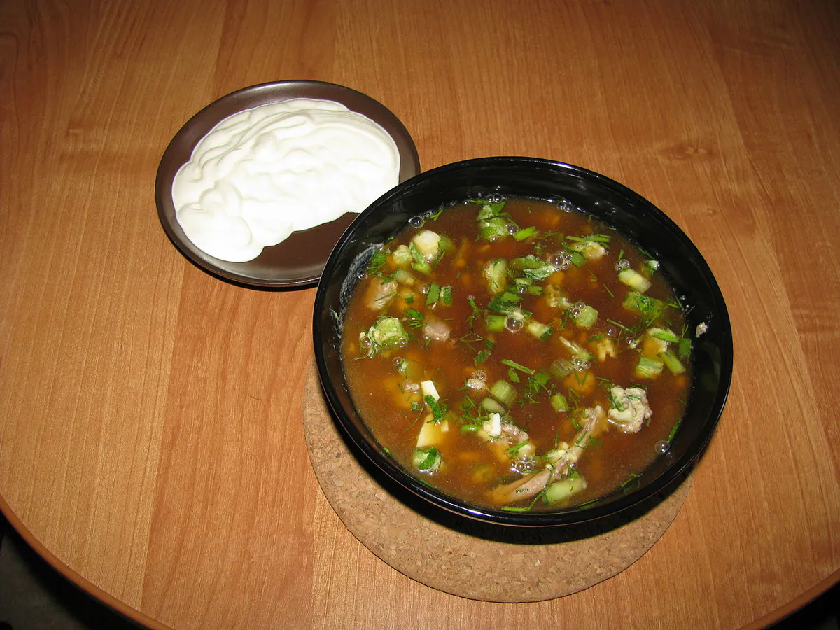 - Поставить окрошку на пару часов в холодильник до полного охлаждения. Достать, разлить по тарелкам, в каждую порцию положить столовую ложку сметаны и подавать, украсив свежей зеленью. По желанию украсить кусочком вареного яйца.
