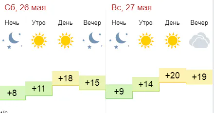 В воскресенье, 27 мая, днем столбики термометра покажут +20 градусов. Вечером ожидается переменная облачность, температура достигнет отметки +18 градусов.