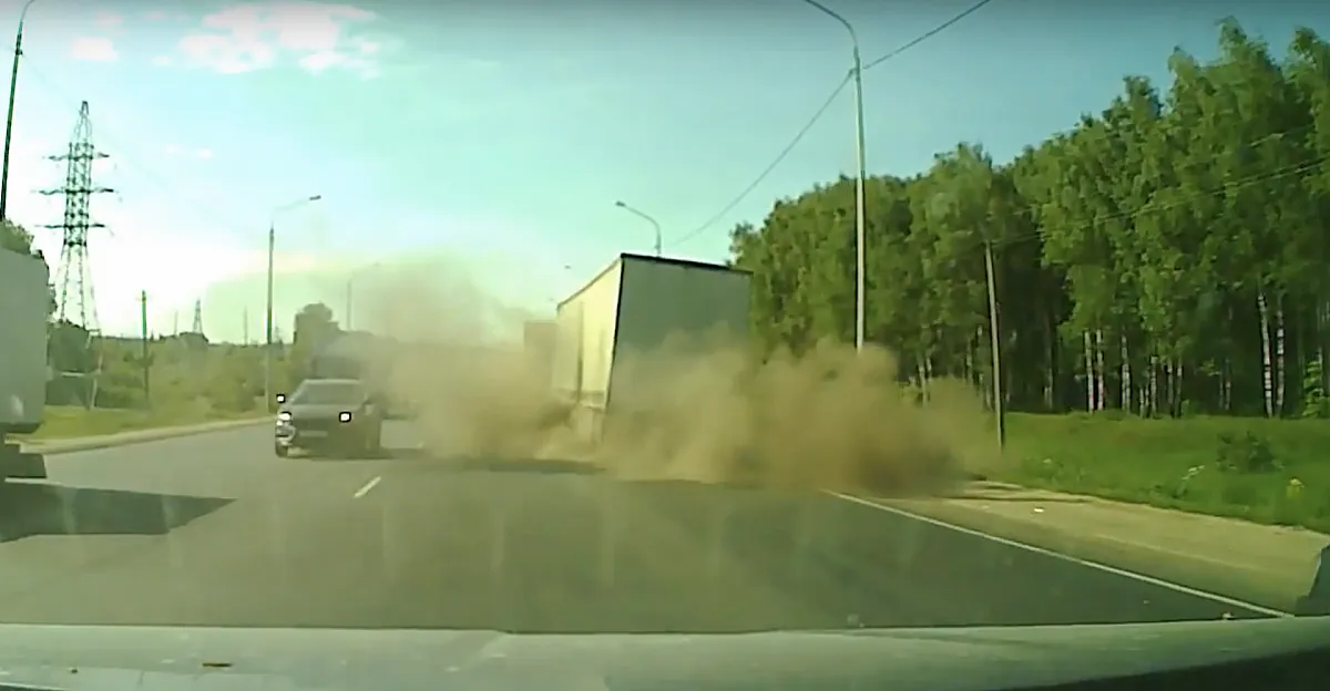 На Южной окружной у фуры взорвалось колесо. Видео