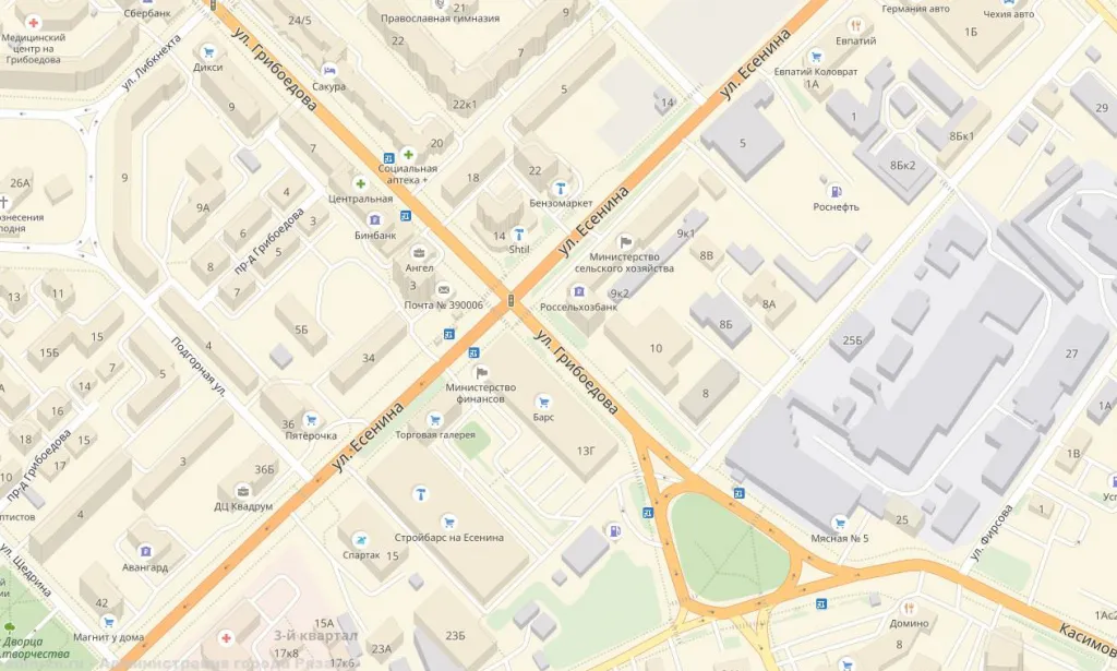 - автобусы №23 от пересечения ул. Ленина с ул. Свободы следует (в прямом и обратном направлении) до Театральной пл., далее по улице Есенина до пересечения с ул. Грибоедова, далее по своему маршруту.