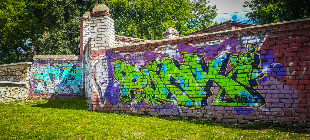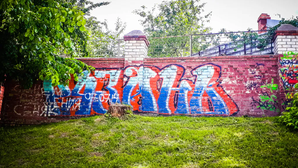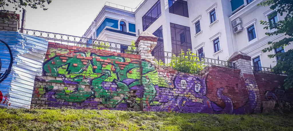 На Лыбедском бульваре на заборах расположены аляповатые надписи в кислотных цветах. Именно с подобных написей было положено начало Стрит-Арту - как самостоятельному уличному искусству.