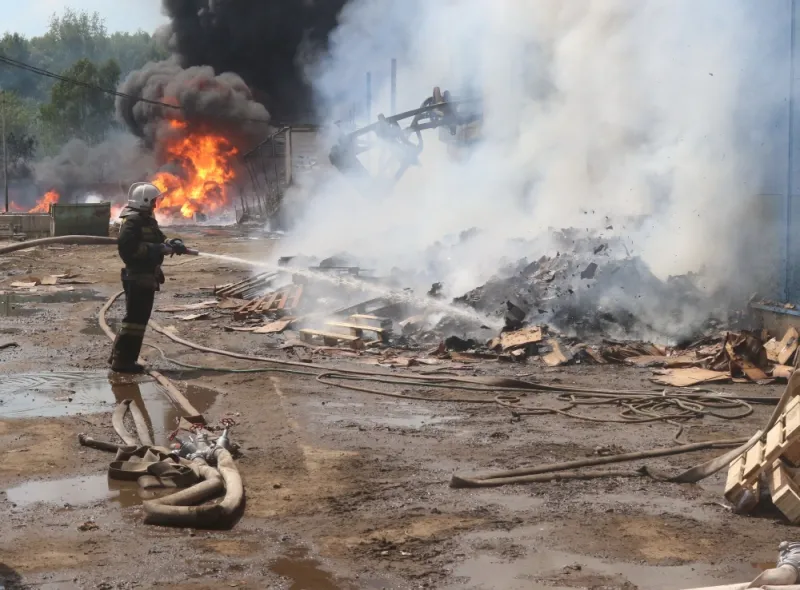 Видео с места пожара на складе картона и пластика в Рязани