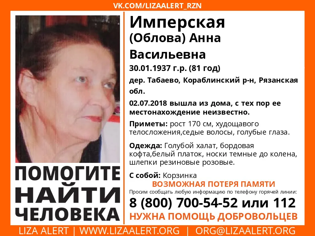Волонтеры поисково-спасательного отряда "Liza Alert" просят рязанцев подключиться к поиску 81-летней Анны Васильевны Имперской (Обловой), которая пропала накануне. 2 июля пенсионерка ушла из своего дома в деревне Табаево (Кораблинский р-н), и в настоящее время ее местонахождение неизвестно. По данным волонтеров, женщина страдает потерей памяти.