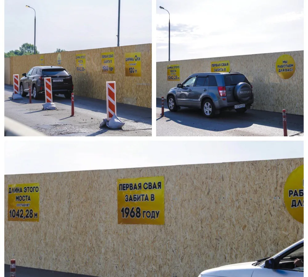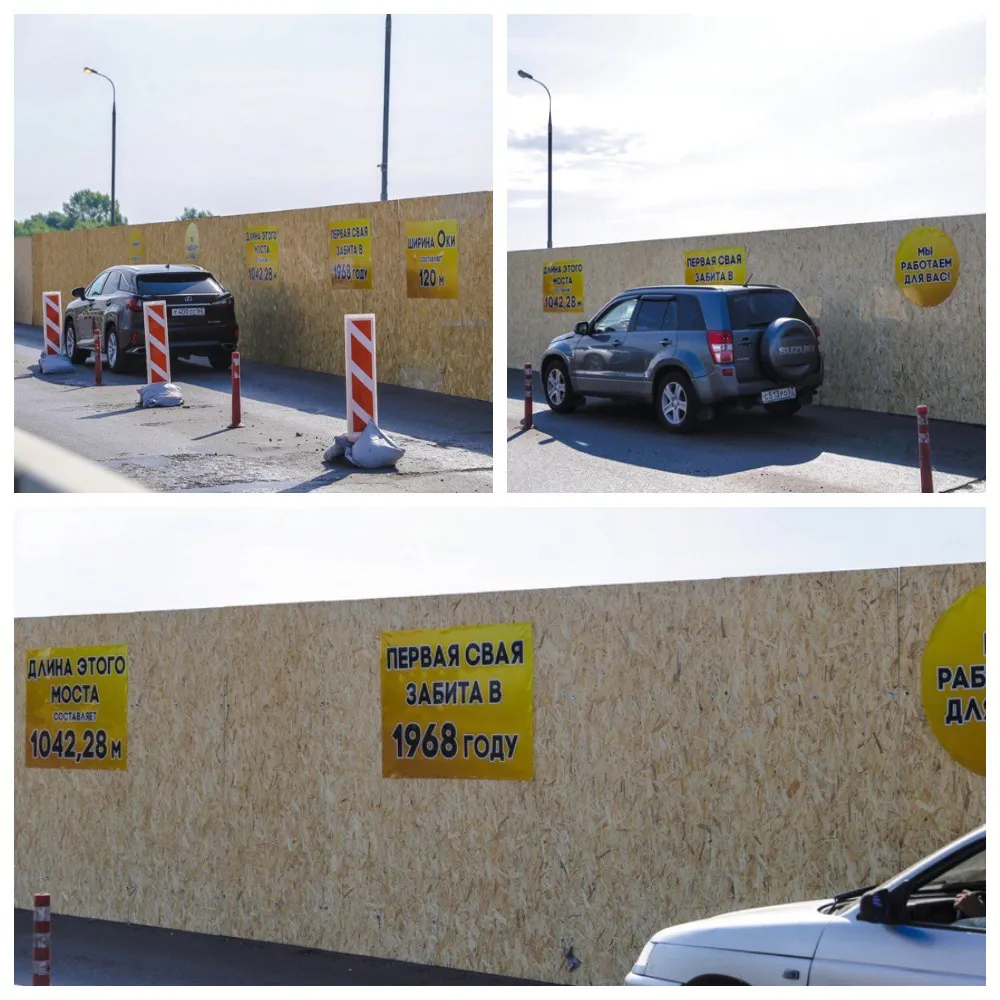 На временном ограждении, рабочие наклеили стикеры с извинениями и интеренсными фактами о постройке моста: