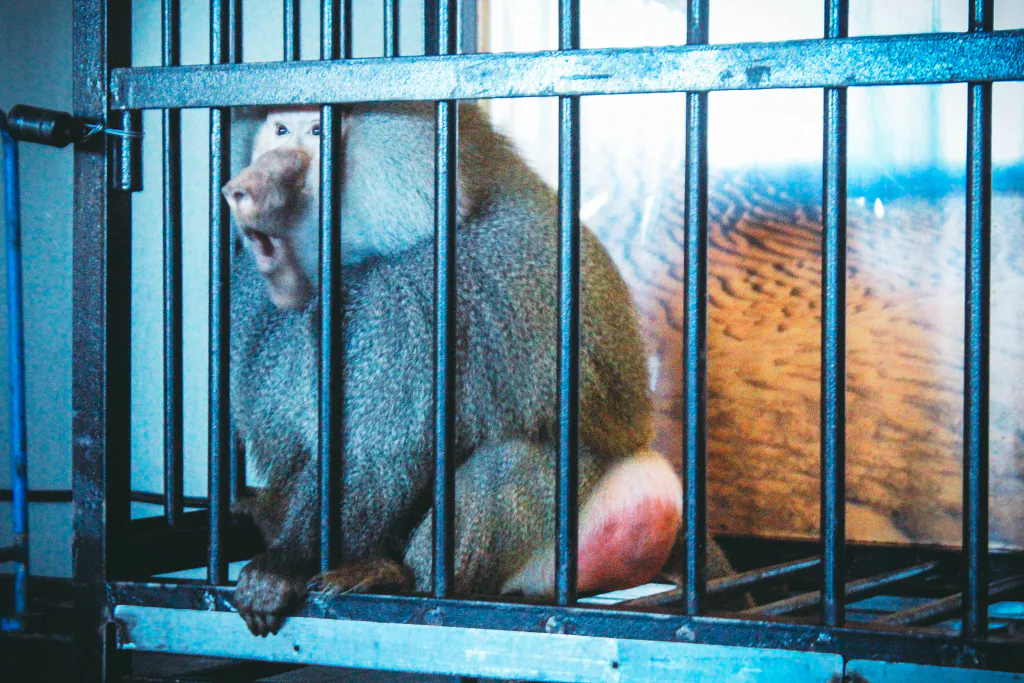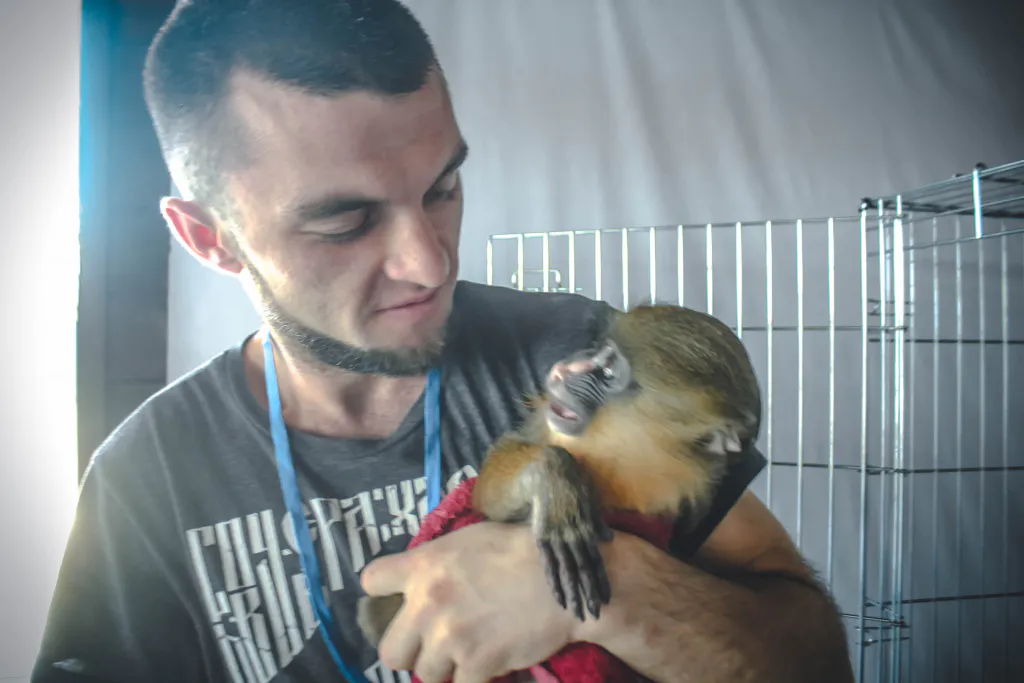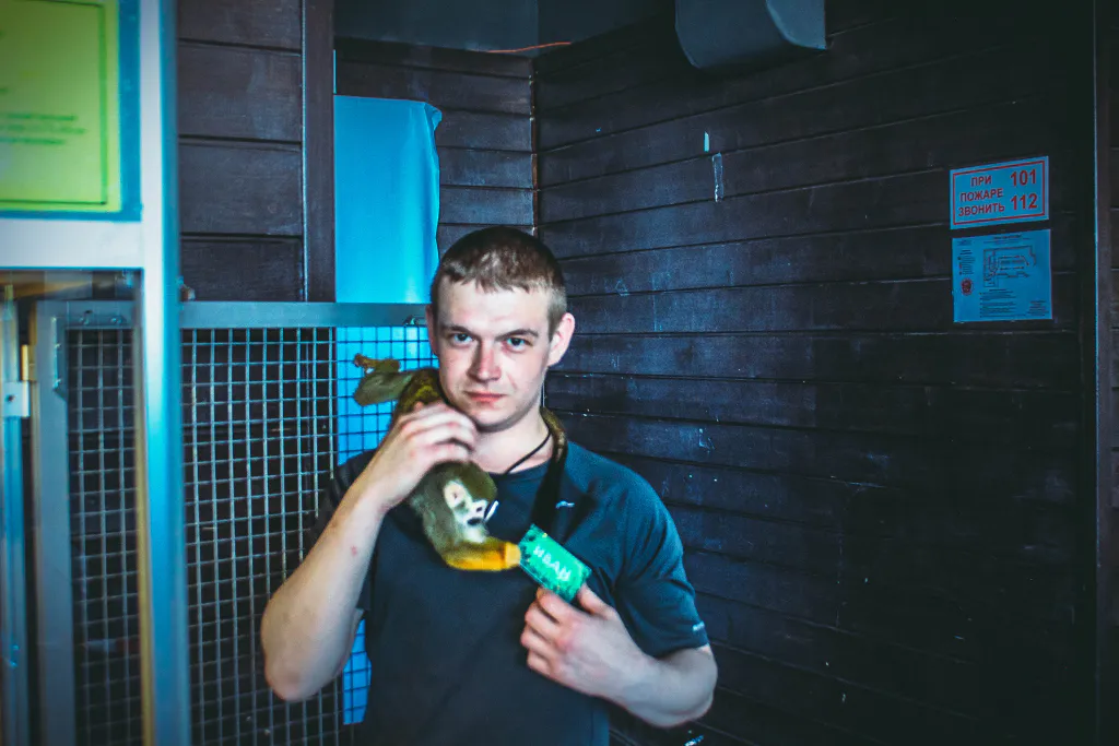 Наш ветеран - Ростислав Максимович. Ему уже 15 лет. Самый главный, самый старший здесь. Примечательно, что когда мы начинаем кормить наших животных, то сначала еду приносим ему, а затем остальным. Если нарушить ритуал, то примат попросту её раскидает по клетке.