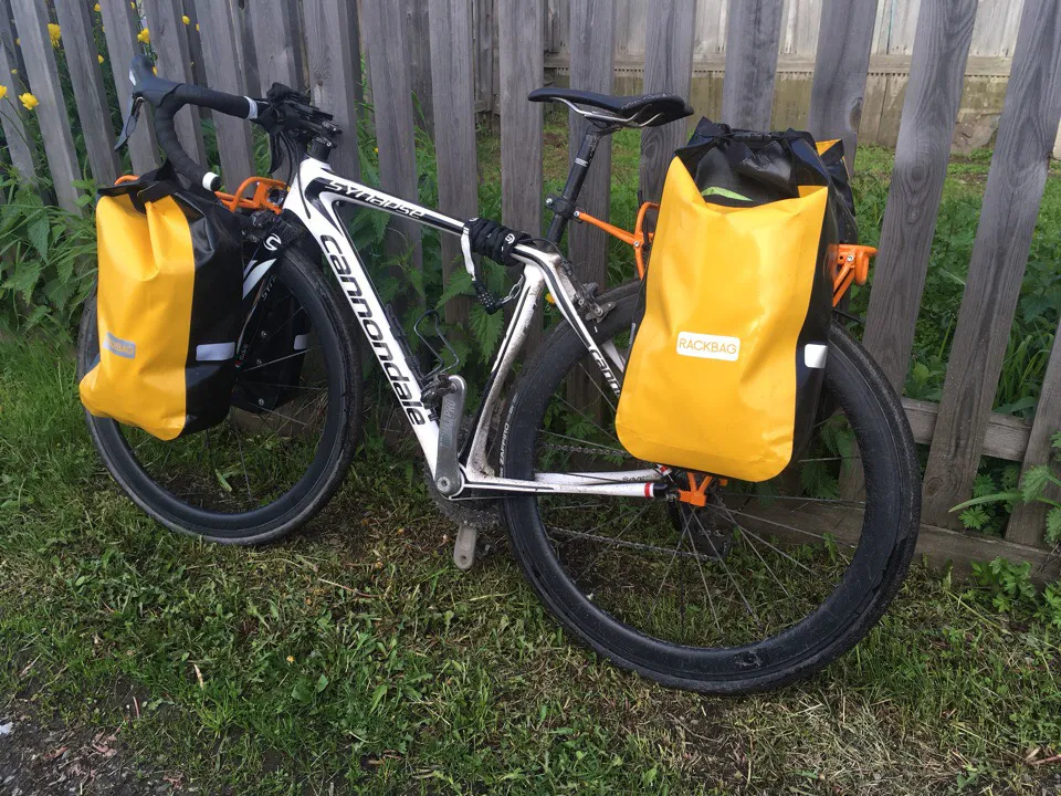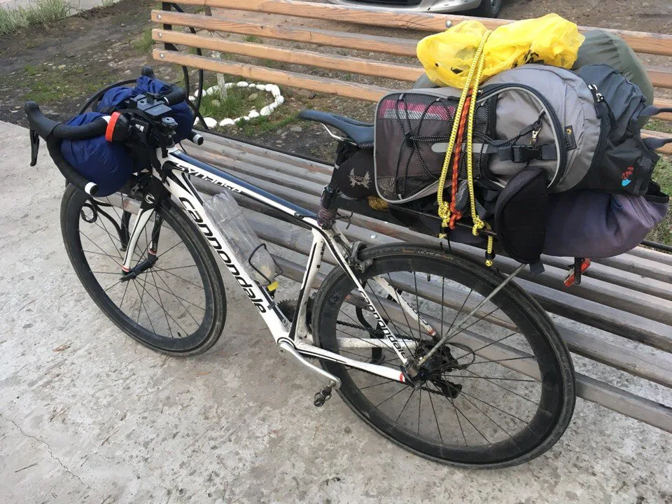 Естественно, с собой приходится возить палатку и минимальный набор вещей. Стараюсь путешествовать налегке, чтобы все уместилось в велосипедных сумках. Кстати, сам велосипед собирался по частям - отдельно покупались шоссейные колеса. Сейчас такой стоит около 4000$.