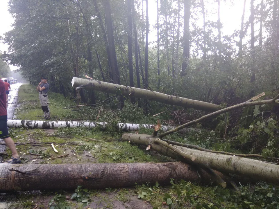 Очевидцы пишут, что бурелом возник на участке между населенными пунктами Передельцы и Кельцы. Шквал и вал деревьев прошел полосой в 500-600 метров и именно такой отрезок дороги оказался заваленным древесными стволами. В настоящий момент дорога расчищена, но мы собираем все подробности, ждите публикации.