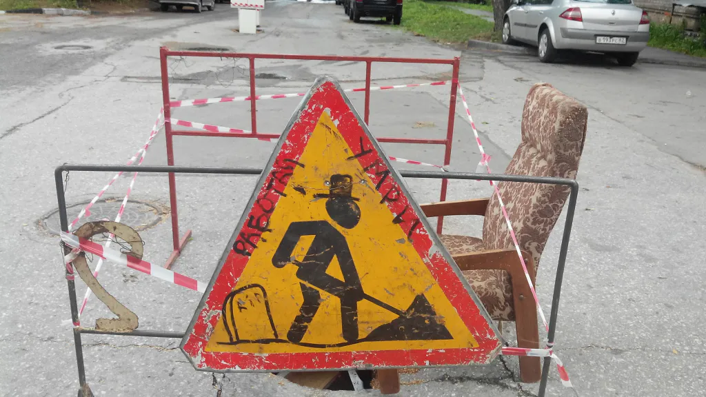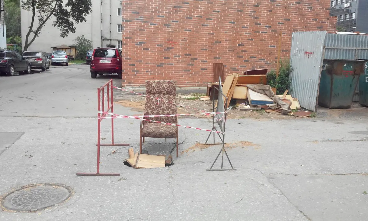 "Стиль лофт": ямы на Скоморошинской огородили холодильником, кухонным гарнитуром и креслом