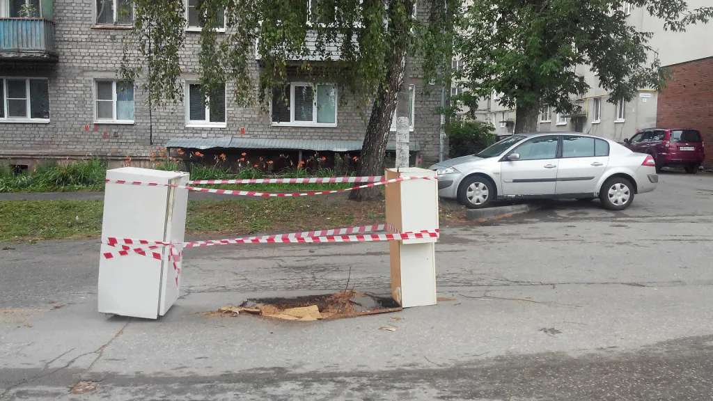 К необычному способу огородить огромные ямы на проезжей части прибегли жители домов на улице Скоморошинской - люди выставили на дорогу старый холодильник, кухонный гарнитур и домашнее кресло.