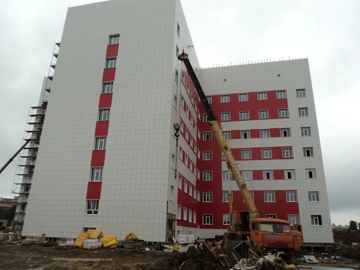 В настоящее время завершено устройство кровли двух блоков. Ведутся работы по устройству вентилируемого фасада, сантехнические, электромонтажные, штукатурные и шпаклевочные работы. На завершающей стадии строительные работы в патологоанатомическом корпусе и пищеблоке.