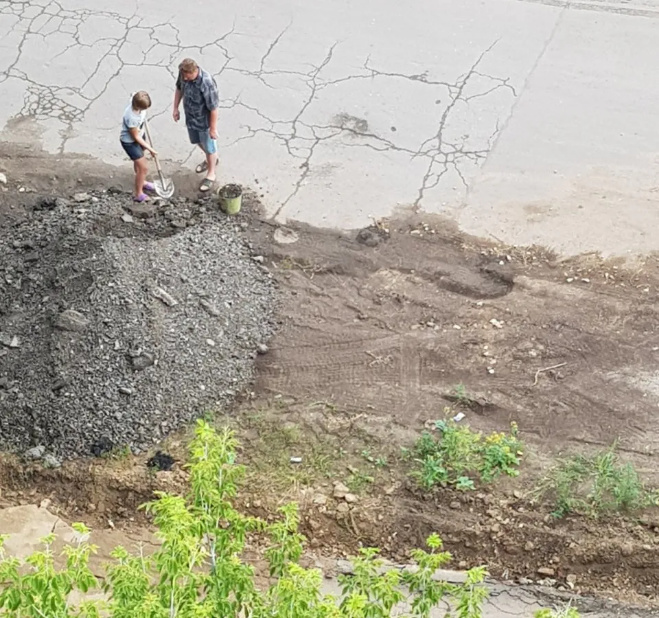 «Вот так у дома по Советской Армии заделывают дыры. Отец со своей дочерью трудятся на благо каждого, а не администрация города», — сообщил автор поста.