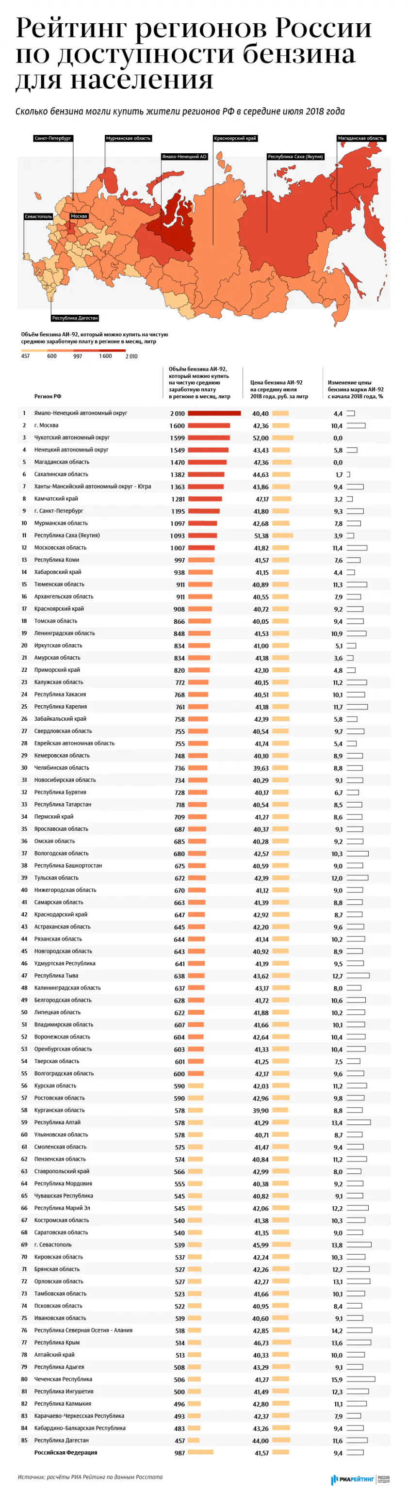 Отмечается, что рейтинг российских регионов составлялся на основе количества бензина марки Аи-92, которое на среднюю зарплату в регионе мог приобрести местный житель в июле 2018 года. По статистическим данным, житель ЯНАО мог приобрести в середине июля более 2 тыс. литров бензина, а житель Дагестана — всего 457 литров.