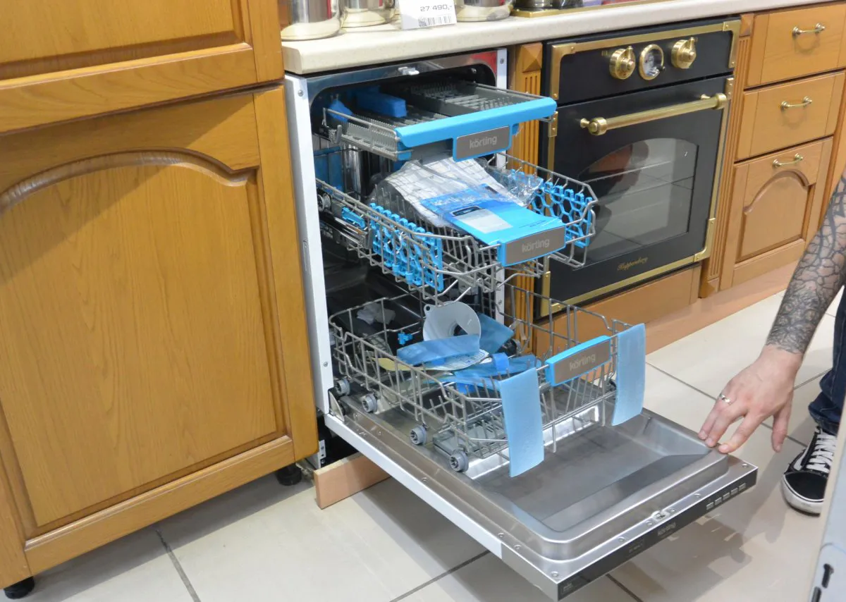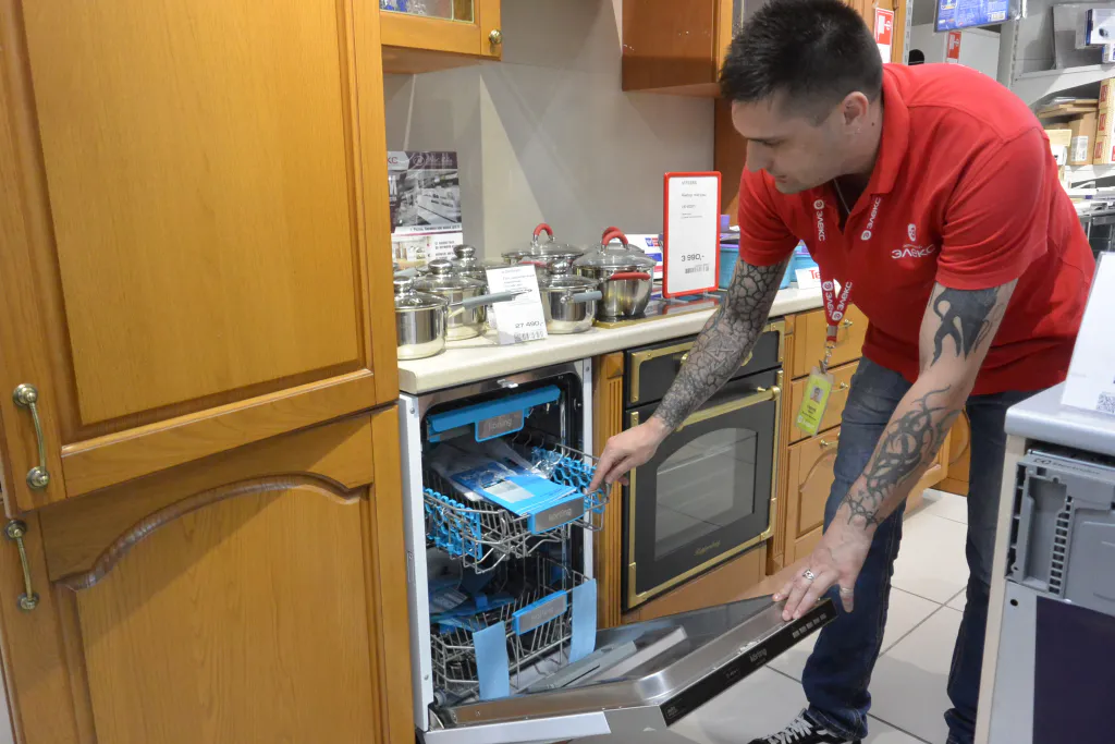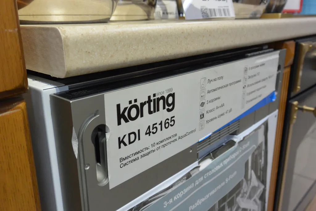 Услышав, что мы интересуемся посудомоечными машинами, Сергей уверенно повел нас в сторону аппарата от малоизвестной российскому потребителю компании Korting. Стоит эта встраиваемая машина умеренно – около 25 тысяч рублей. Но, как уверяет консультант, схожий по возможностям аналог от более известных брендов будет стоить около 42 тысяч рублей.