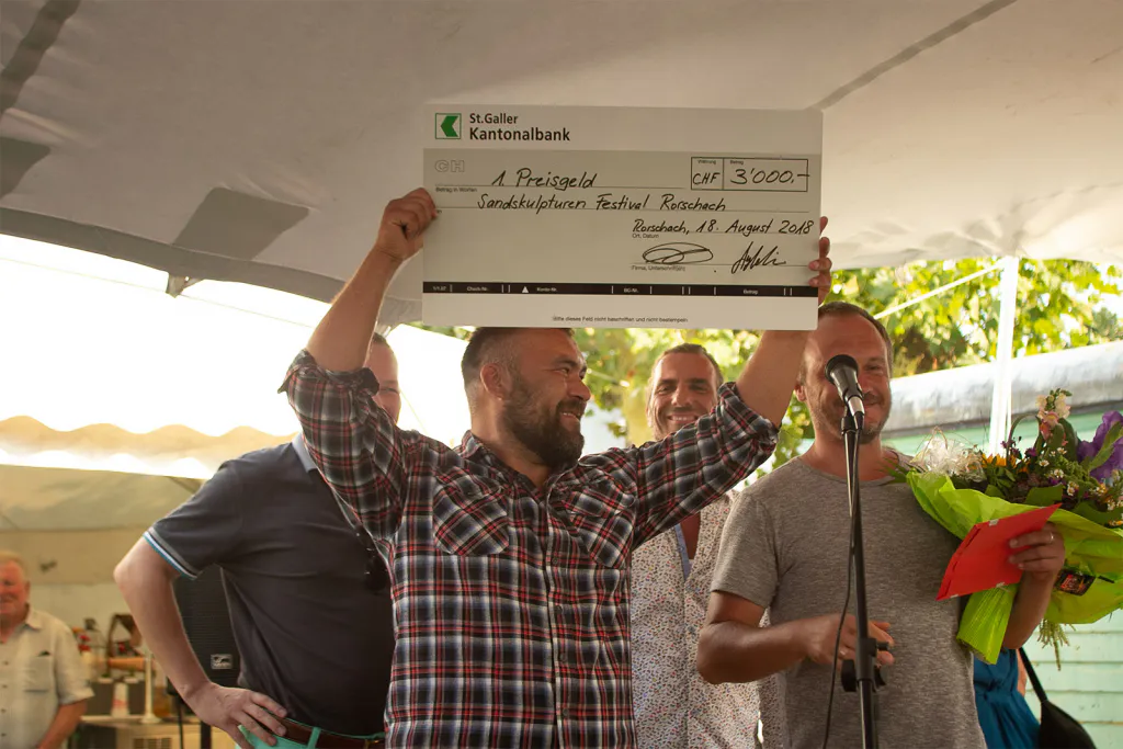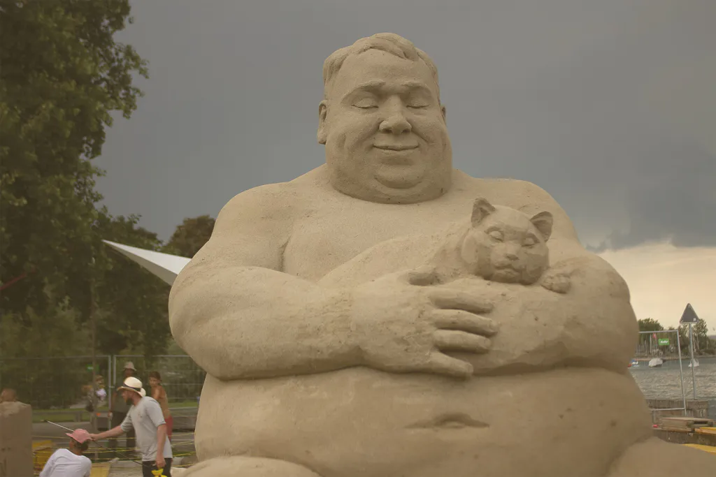 В Швейцарии завершился международный фестиваль песчаных скульптур. В мастерстве состязались более двадцати профессионалов из разных уголков мира. Целую неделю десять команд создавали песчаные скульптуры на берегу Боденского озера в городе Роршах. Лучшей был признана скульптура мужчины с котенком. Создали ее два мастера - рязанец Евгений Тарнопольский и его коллега из Санкт-Петербурга.