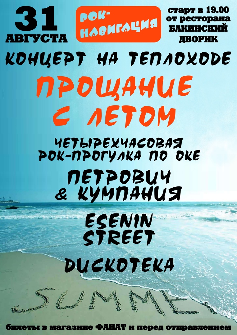 Крейсер «Непросыхающий» отправляется в своё финальное рок-плаванье в сезоне. В этот вечер гостей ждёт четырёхчасовая рок-прогулка по реке Оке, выступление лучшей кавер-группы Рязани Esenin Street, выступление группы "Петрович и Кумпания", дикотека и фейерверк. Подробнее по ссылке - тут.