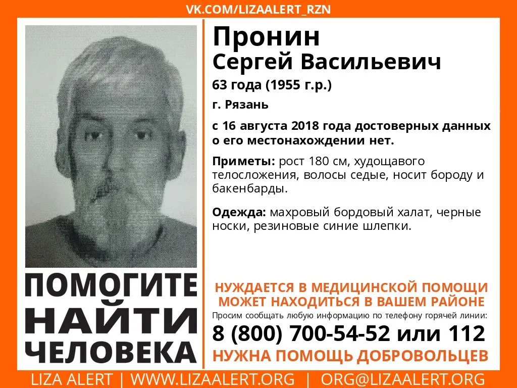 В Рязани пропал 63-летний Пронин Сергей Васильевич, сообщается в группе Поисково-спасательный отряд "Liza Alert Рязань" -с 16 августа достоверных данных о его местонахождении нет. По информации волонтеров, мужчина нуждается в мдицинской помощи и может находиться в любом из районов города.