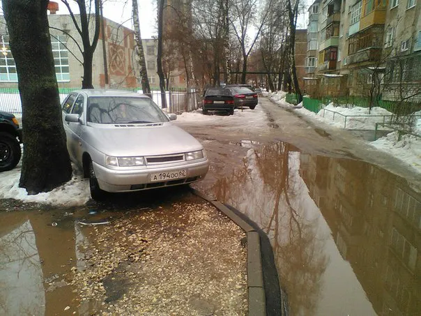 Рязанка Анна Чикина опубликовала в соцсетях фото неправильно  припаркованного авто на улице Черновицкой, напротив 19 школы. Из-за него женщине с двумя детьми пришлось идти через глубокую лужу.