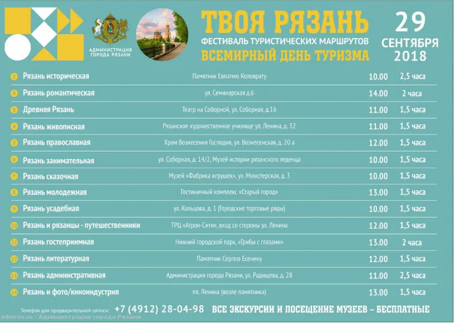 В субботу, 29 сентября в Рязани пройдет фестиваль туристических маршрутов «Твоя Рязань» - мероприятие приурочено ко Всемирному Дню туризма.