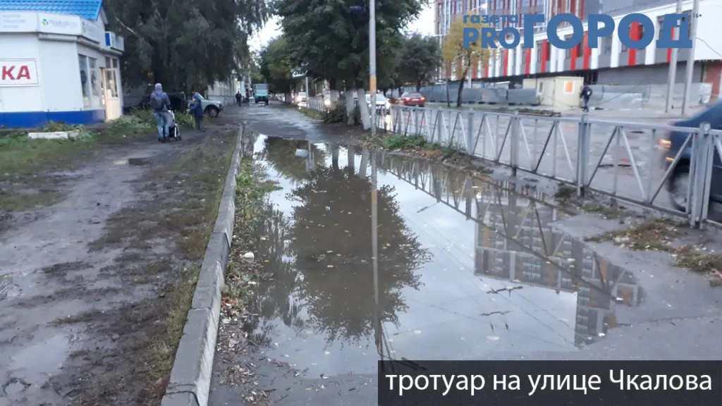 Тротуар на улице Чкалова - место, где не стоит ходить после дождя! Тротуар обильно заливается водой и под ногами образуются огромные лужи, которые обойти практически невозможно. При преодолевании водных преград - велика вероятность промочить ноги и испачкать одежду.