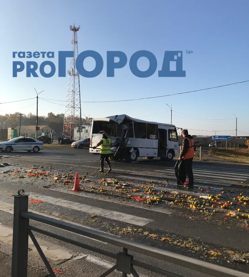 По предварительной информации, фура Вольво, котороя двигалась со стороны Москвы и перевозила фрукты, врезалась в попутный автобус 241 маршрута Рыбное-Рязань.
