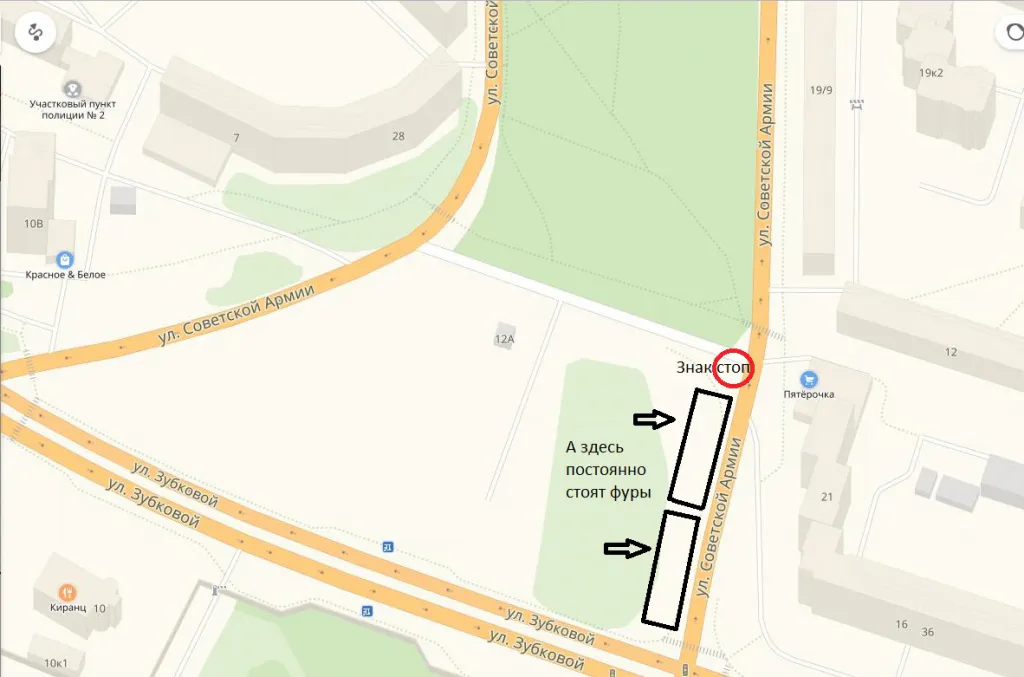 По правилам, я обязана остановиться перед знаком "Стоп", чтобы посмотреть на возможное препятствие справа. Но стоящая прямо за знаком фура уже сама по себе препятствие, из-за которого не видно дорогу. И я должна в итоге сначала перед знаком остановиться, а потом еще перед фурой остановиться и из-за нее выглядывать, что там на дороге. И так каждый раз! Это вообще законно, что они тут стоят?