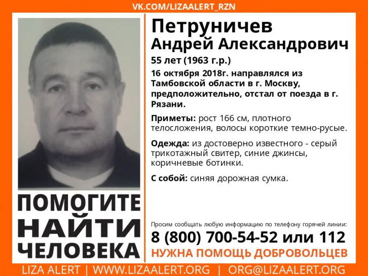 В Рязани ищут 55-летнего Андрея Петруничева. Информация об этом появилась в группе поисково-спасательного отряда «ЛизаАлерт Рязань».